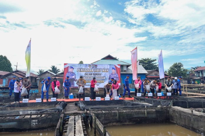 LANGKAR.ID, Banjarmasin – Puluhan ribu bibit ikan patin ditebar di Banua Anyar, Banjarmasin, dalam kegiatan bakti sosial yang digelar Polda Kalimantan Selatan dan BKKBN Kalsel, Kamis (9/1). Acara ini juga dirangkai dengan pemberian bantuan untuk anak stunting, sebagai bagian dari upaya menekan angka kekurangan gizi di kota tersebut.