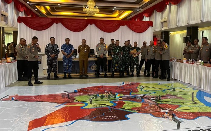 LANGKAR.ID, Banjarmasin – Mengantisipasi terjadinya chaos pemilu mendatang, Polda Kalsel menggelar Peta Tactical Floor Game (TFG) Unjuk Rasa di Kantor KPU Kalsel dan Rapat Koordinasi dalam rangka perbantuan TNI kepada Polri untuk pengamanan Pemilu 2024, di Aula Mathilda, Polda Kalsel, Senin (12/2/2023).