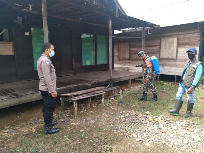 LANGKAR.ID,Barabai- Dalam rangka meminimalisir penyebaran covid-19, Bintara Pembina Desa (Babinsa) Koramil 1002-08/LAS melakukan penyemprotan disinfektan di lokasi Pra TMMD di Desa Rantau Keminting Kec.Labuan Amas Utara Kab.Hulu Sungai Tengah, Minggu (5/9/2021).