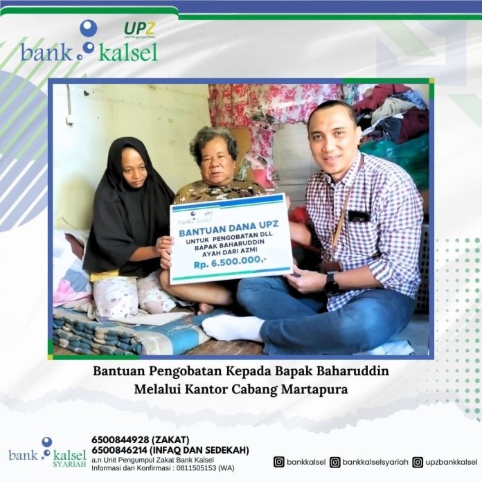 Kantor Cabang Martapura hari ini memberikan bantuan dana pengobatan kepada Baharuddin, yang menderita sakit asam lambung akut yang telah menyebar ke paru-paru dan jantung, mengakibatkan kesulitan bernapas. Bantuan ini disalurkan melalui UPZ Bank Kalsel, dengan penyerahan secara simbolis oleh Kepala Kantor Cabang Martapura, Khuzaimi.