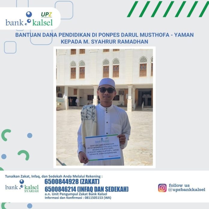 Berdasarkan hal tersebut UPZ Bank Kalsel memberikan bantuan dana pendidikan kepada M. Syahrur Ramadhan agar dapat meringankan biaya hidup dan biaya akomodasi lainnya selama menuntut ilmu di Ponpes Darul Musthofa, Tarim, Yaman.