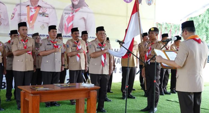 LANGKAR.ID BANJARBARU – Ketua Kwartir Nasional (Kwarnas) Gerakan Pramuka Budi Waseso melantik Gubernur Kalimantan Selatan H Sahbirin Noor menjadi Ketua Majelis Pembimbing Daerah Gerakan Pramuka Kalimantan Selatan Masa Bakti Tahun 2022-2027, di Kiram Park, Sabtu (4/2/2023).