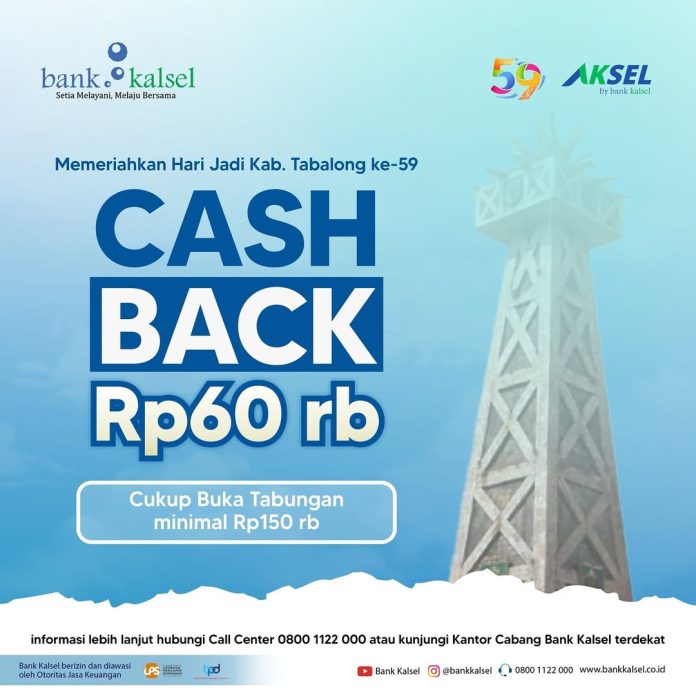 LANGKAR.ID, Tabalong – Bank Kalsel merayakan Hari Jadi ke-59 Kabupaten Tabalong dengan promo menarik untuk masyarakat. Cukup buka tabungan minimal Rp150 ribu, #SobatBankKalsel langsung mendapatkan cashback Rp60 ribu.