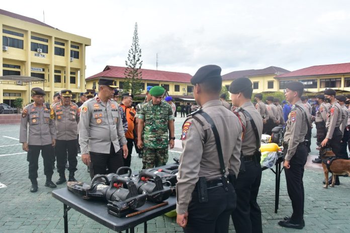 LANGKAR.ID, Banjarmasin – Sebagai wujud kesiapsiagaan kerawanan bencana alam yang biasa terjadi di Wilayah Kalimantan Selatan (Kalsel), khususnya di penghujung akhir tahun. Polda Kalsel menggelar apel pengecekan personel dan peralatan satgas kontijensi, dalam rangka menghadapi bencana pada operasi lilin intan 2022, di Halaman Polda Kalsel, Jum’at (30/12/2022).