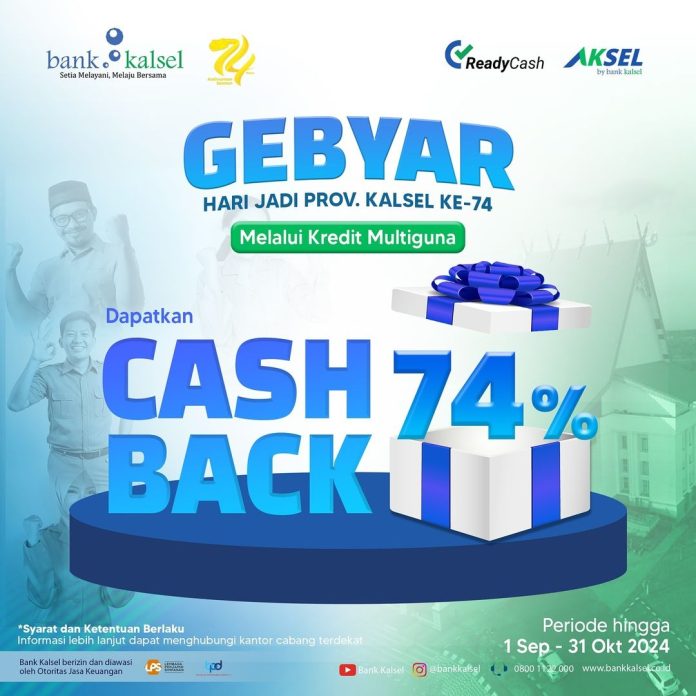 LANGKAR.ID, Banjarmasin – Dalam rangka memperingati Hari Jadi ke-74 Provinsi Kalimantan Selatan, Bank Kalsel menggelar promo besar-besaran dengan cashback hingga 74% bagi nasabah yang mengajukan Kredit Multiguna. Promo spesial ini memberikan kesempatan bagi masyarakat untuk menikmati kemudahan finansial sekaligus mendapatkan cashback yang melimpah.