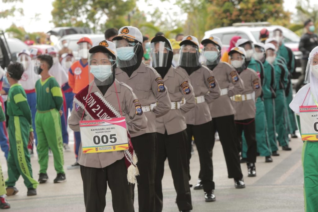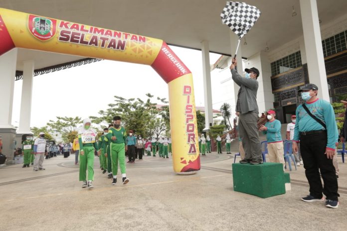 Lomba gerak jalan dengan kategori 17 Km, 8 Km dan 45 Km yang diselenggarakan oleh Dinas Pemuda dan Olahraga (Dispora) Kalsel ini menerapkan protokol kesehatan ketat. Para peserta yang hadir diminta mengenakan masker dan face shield serta menjaga jarak dalam barisan.