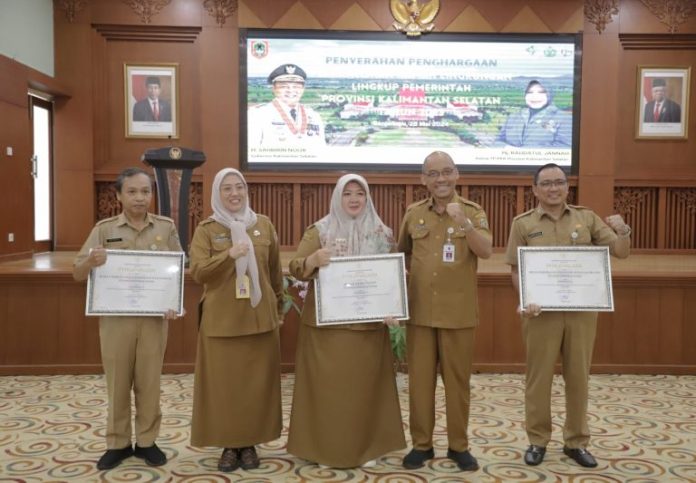 LANGKAR.ID, BANJARBARU – Gubernur Kalimantan Selatan, H. Sahbirin Noor, yang akrab disapa Paman Birin, melalui Staf Ahli Bidang Pemerintahan, Hukum, dan Politik, Adi Santoso, menyerahkan Penghargaan Perkantoran Ramah Lingkungan kepada SKPD (Satuan Kerja Perangkat Daerah) lingkup Pemprov Kalsel tahun 2023. Acara berlangsung di Gedung DR KH Idham Khalid Banjarbaru, Senin (28/05/2024)