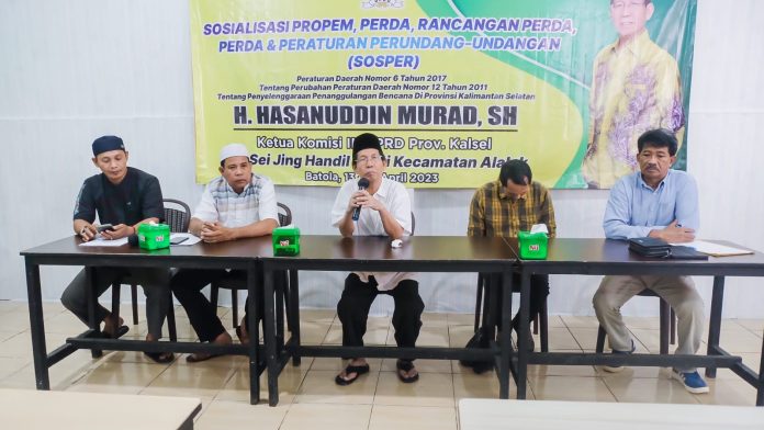 LANGKAR.ID BATOLA – Ketua Komisi III DPRD Kalsel H. Hasanuddin Murad, mensosialisasikan Peraturan Daerah (Perda) Nomor 6 Tahun 2017 tentang Penyelanggaraan Penanggulangan Bencana di Provinsi Kalimantan Selatan, Minggu (16/4/2023) di Rumah Makan Sei Jing, Handil Bakti.