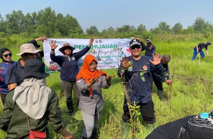 LANGKAR.ID, Banjarmasin – Membantu menjaga keseimbangan ekosistem lahan basah serta mengurangi dampak perubahan iklim, Bidang Humas Polda Kalsel melakukan penanaman mangrove jenis rambai di Pulau Curiak, Kabupaten Barito Kuala, Jum’at (13/10/2023).