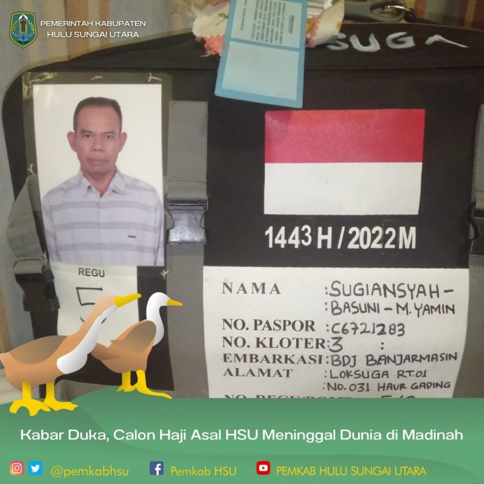 Jemaah Calon Haji (JCH) asal Hulu Sungai Utara (HSU) yang tergabung dalam kloter 3 Embarkasi Banjarmasin, Sugiansyah Basuni M Yamin (49) meninggal dunia, Minggu (19/6/2022) di Madinah.