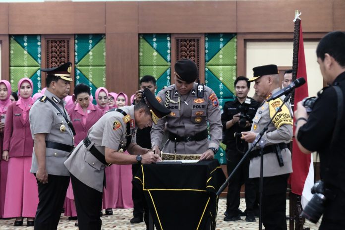 LANGKAR.ID, Banjarbaru – Kapolda Kalsel Irjen Pol Rosyanto Yudha Hermawan memimpin serah terima jabatan (Sertijab) sekaligus melantik empat pejabat utama (PJU) dan empat Kapolres, di Gedung Dr KH Idham Chalid Pemprov Kalsel, Banjarbaru, Selasa (8/4/2025).