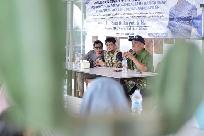 LANGKAR.ID, Barito Kuala – Ketua Komisi I DPRD Kalimantan Selatan, H. Rais Ruhayat, menggelar sosialisasi Peraturan Daerah (Perda) Nomor 8 Tahun 2023 tentang Fasilitasi Pencegahan dan Pemberantasan Penyalahgunaan serta Peredaran Gelap Narkotika, Prekursor Narkotika, dan Psikotropika. Acara ini berlangsung di Kabupaten Barito Kuala, Senin (21/1/2025).