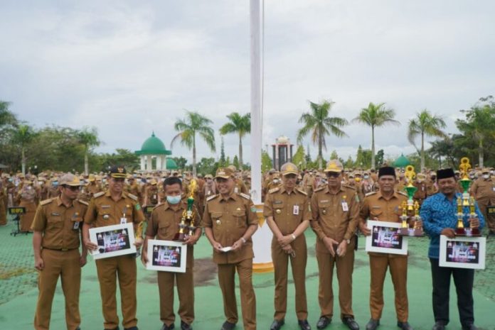 Usai apel gabungan, Bupati menyerahkan piagam kepada SKPD Tanah Bumbu yang menjadi pemenang pintu gerbang terbaik. (*/L008)