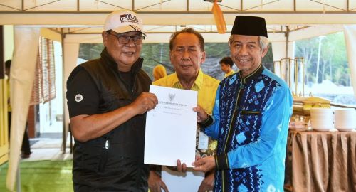 Penyerahan Surat Keputusan (SK) secara simbolis dilakukan oleh Paman Birin kepada Ketua Tim Tenaga Ahli Gubernur, Noor Aidi, di Alam Roh 24, Kiram, Kabupaten Banjar Kamis (12/10/2023)