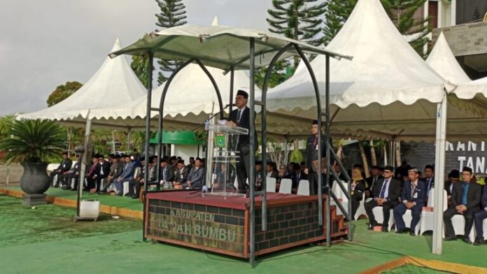 Upacara peringatan dipimpin langsung Bupati Tanah Bumbu HM Zairullah Azhar, Selasa (2/5/2023) di halaman kantor Bupati di Gunung Tinggi, Kecamatan Batulicin.