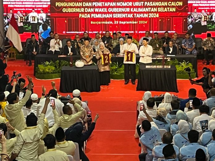 LANGKAR.ID, Banjarmasin – Nomor urut dua pasangan calon (paslon) yang akan bertarung pada Pemilihan Kepala Daerah (Pilkada) Kalimantan Selatan (Kalsel) sudah diketahui setelah Komisi Pemilihan Umum (KPU) Kalsel menggelar sidang pleno pengundian dan penetapan nomor urut paslon pada, Senin (23/9/2024) malam.