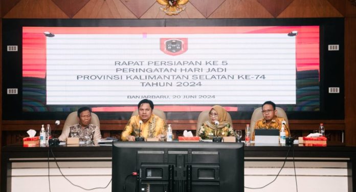 LANGKAR.ID,BANJARMASIN – Pemerintah Provinsi Kalimantan Selatan menggelar rapat kelima untuk persiapan pelaksanaan rangkaian peringatan Hari Jadi ke-74 Provinsi Kalsel tahun 2024. Rapat ini diadakan pada Kamis (20/6/2024) di ruang rapat Aberani Sulaiman, Kantor Gubernur Kalsel, Banjarbaru.