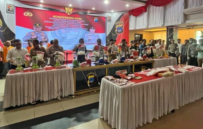 “Diketahui narkoba jaringan internasional segi tiga emas (Burma, utara Laos dan bagian utara Thailand) masuk ke Kalsel bervariatif, kali ini jaringan tersebut masuk melalui wilayah barat, yaitu Kalimantan Barat,” katanya saat konferensi pers pengungkapan dan pemusnahan, di Aula Mathilda Batlayeri Polda Kalsel, Selasa (31/10/2023).