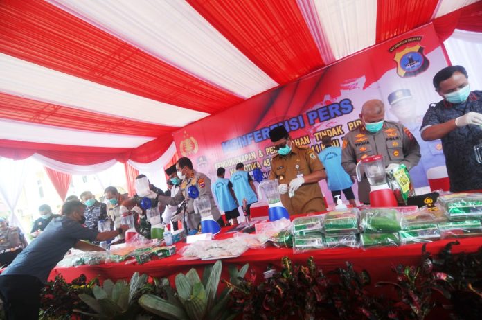 Barang bukti yang diamankan, Sabu sebanyak 45 kilogram serta ineks sebanyak 11.792 ribu butir tersebut dibungkus menggunakan kemasan teh Cina.