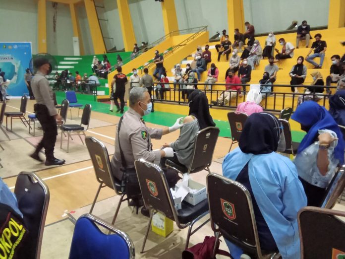 LANGKAR.ID , Banjarmasin – Polda Kalimantan Selatan melalui program vaksin Nasional berbasis presisi Polri menuju Herd Imunity di Indonesia, Rabu (18/08/2021) kembali menggelar vaksin massal di Gor Hassanudin Banjarmasin.