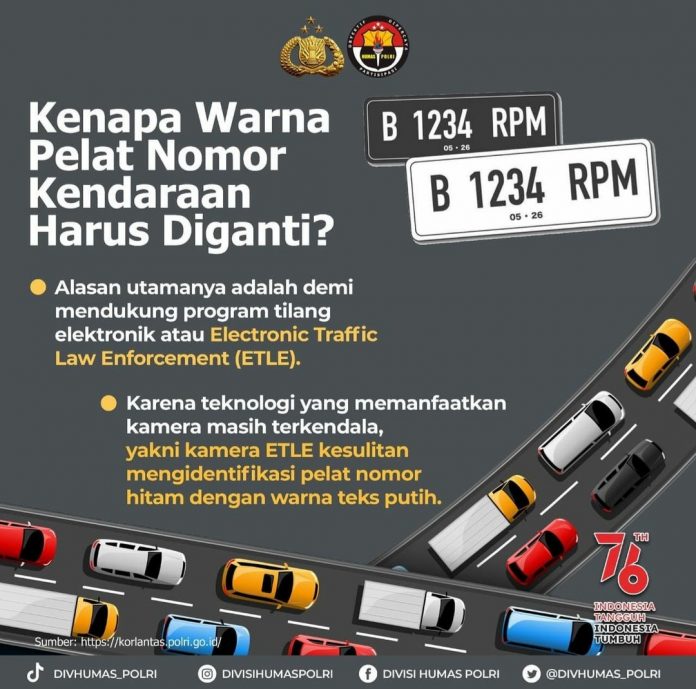 Kemudian, warna baru pelat nomor kendaraan ini, demi mendukung program tilang elektronik. Atau disebut juga dengan Electronic Traffic Law Enforcement(ETLE).