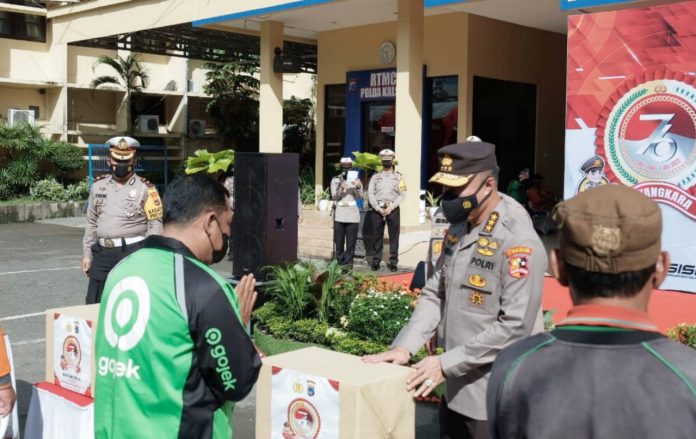 LANGKAR.ID, Banjarmasin – Rangkaian Hari Bhayangkara Ke-76 yang jatuh pada 1 Juli 2022 dikemas dalam bantuan paket sembako pada kegiatan bakti sosial di Polda Kalsel, Jalan S Parman, Banjarmasin, Senin (20/6/2022).
