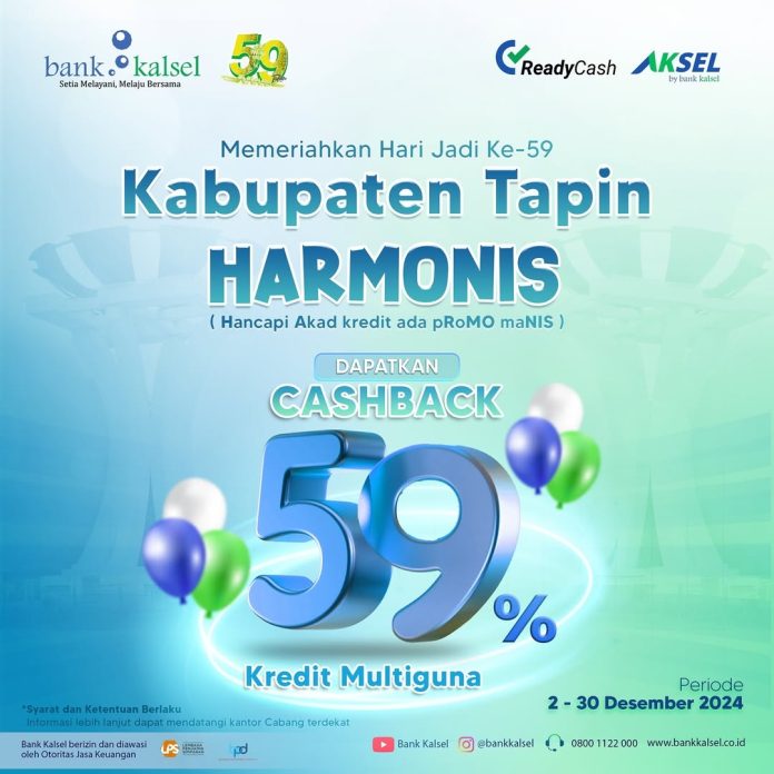 LANGKAR.ID, Tapin – Dalam rangka Hari Jadi ke-59 Kabupaten Tapin, Bank Kalsel menghadirkan promo spesial bertajuk HARMONIS (Hancapi Akad Kredit Ada Promo Manis). Program ini menawarkan cashback hingga 59% bagi nasabah yang menggunakan produk Kredit Multiguna Bank Kalsel.