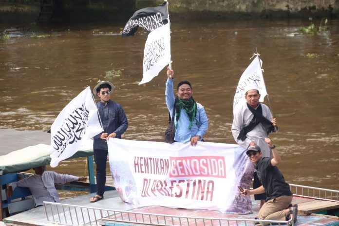 Diatas klotok itu berkibar gagah di atasnya bendera putih dan hitam bertuliskan lafaz tauhid. Bersamaan itu membentang spanduk seruan ‘Hentikan genosida di Palestina’.
