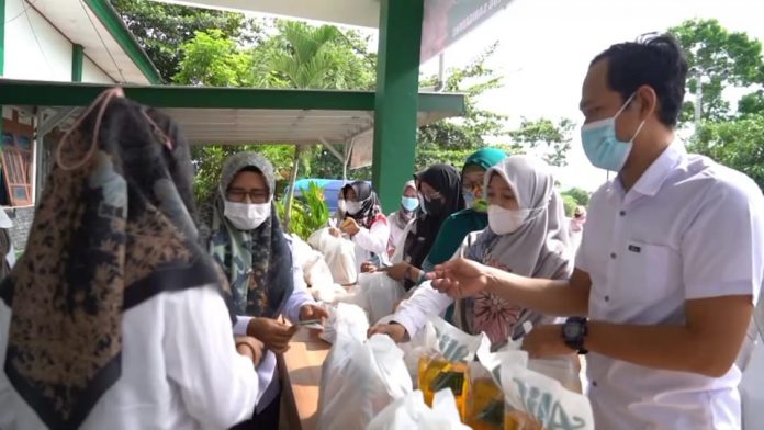 Kegiatan ini ditandai dengan penyerahan paket sembako secara simbolis oleh Ketua TP PKK Tanah Bumbu, Wahyu Windarti Zairullah kepada seorang pembeli.