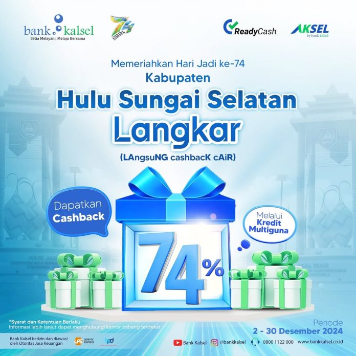 LANGKAR.ID,Hulu Sungai Selatan – Dalam rangka Hari Jadi ke-74 Kabupaten Hulu Sungai Selatan (HSS), Bank Kalsel menghadirkan promo spesial yang sayang untuk dilewatkan. Lewat program LANGKAR (Langsung Cashback Cair), nasabah bisa menikmati cashback hingga 74% saat menggunakan produk Kredit Multiguna Bank Kalsel.
