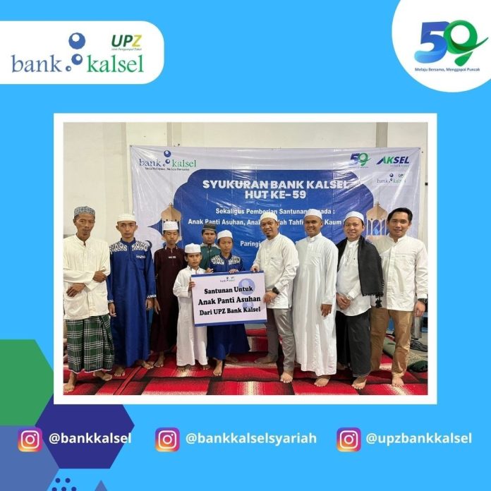 LANGKAR.ID BANJARMASIN Dalam rangka HUT Bank Kalsel ke 59 dan sebagai wujud rasa syukur atas karunia yang diberikan hingga usia 59 tahun, Bank Kalsel melalui Unit Pengumpul Zakat (UPZ) Bank Kalsel telah memberikan bantuan berupa dana operasional Panti Asuhan dan santunan kepada anak panti asuhan, anak tahfidz, serta kaum masjid.