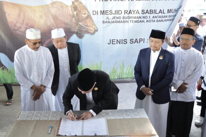 Penyerahan sapi kurban dilakukan oleh Gubernur Kalsel H. Muhidin dan disaksikan Wakil Gubernur Hasnuryadi Sulaiman. Sapi diserahkan langsung kepada Wakil Ketua Badan Pengelola Masjid Raya, H.M. Fadlian Noor.