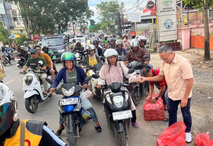 Menggandeng Persatuan Wartawan Indonesia (PWI) Kalsel, sebanyak 250 kotak takzil dibagikan untuk pengendara yang melintas di depan PWI Kalsel, Jalan Pangeran Hidayatullah, Selasa (23/3/2025).