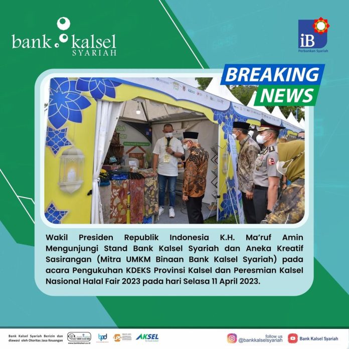 LANGKAR.ID BANJARMASIN – Wakil Presiden Republik Indonesia K.H. Ma’ruf Amin Mengunjungi Stand Bank Kalsel Syariah dan Aneka Kreatif Sasirangan (Mitra UMKM Binaan Bank Kalsel Syariah) pada acara Pengukuhan KDEKS Provinsi Kalsel dan Peresmian Kalsel Nasional Halal Fair 2023 di Halaman Kantor Gubernur Kalimantan Selatan Jalan Jenderal Sudirman Nomor 4, Antasan Besar, Kecamatan. Selasa 11 April 2023