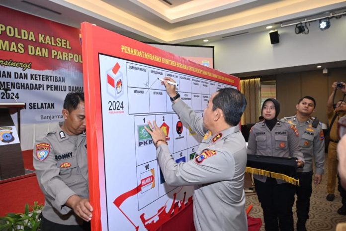 Demi menciptakan kerjasama yang erat, guna menjamin pelaksanaan Pemilihan Umum (Pemilu) tahun 2024 yang damai dan tertib di wilayah Provinsi Kalsel, Kapolda Kalsel Irjen Andi Rian R Djajadi menggelar pertemuan dan menandatangani komitmen pemilu damai dengan Forkopimda, Ormas dan Parpol, di Hotel Rattan In, Senin (7/8/2023).