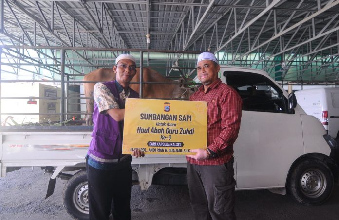 Sumbangan 2 ekor sapi juga diserahkan Polda Kalsel, melalui PS Kasubdit Intelkam Kompol Chairuddin Hakim kepada panitia haul di Kubah Guru Zuhdi Jalan Masjid Jami Kelurahan Sungai Jingah Kecamatan Banjarmasin Utara, Selasa (28/3/2023).