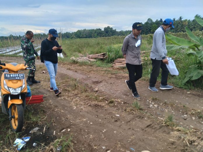Didampingi oleh Kapten Czi Obet Subagiyo, Babinsa Serka Suhartono dan Koptu Suriansyah, konsultan melakukan pengukuran dan pemasangan patok dari STA-0 hingga ke STA-1725.