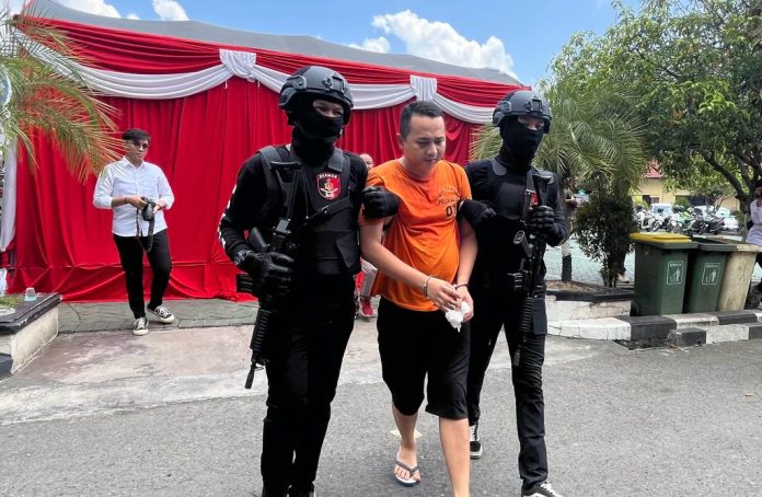 LANGKAR.ID, Banjarmasin – Terancam hukuman seumur hidup dan hukuman mati, Mohammad Ramadhan, alias Rama, alias Agung yang mengaku inspektur polisi satu hampir pingsan saat digiring anggota Jatanras Ditreskrimum Polda Kalsel usai konferensi pers, di lapangan Polda Kalsel, Rabu (18/10/2023).