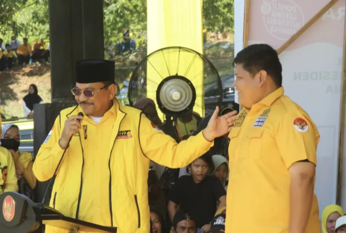 LANGKAR.ID BANJARMASIN – Ketua DPRD yang juga Sekretaris DPD Partai Golkar Provinsi Kalsel Supian HK, memperkenalkan tokoh muda Sandi Fitrian Noor saat ditengah ribuan massa dan simpatisan yang hadir dalam pertemuan terbatas di Kiram Park, Desa Kiram, Kecamatan Karang Intan, Kabupaten Banjar pada Kamis (8/2/2024) siang.