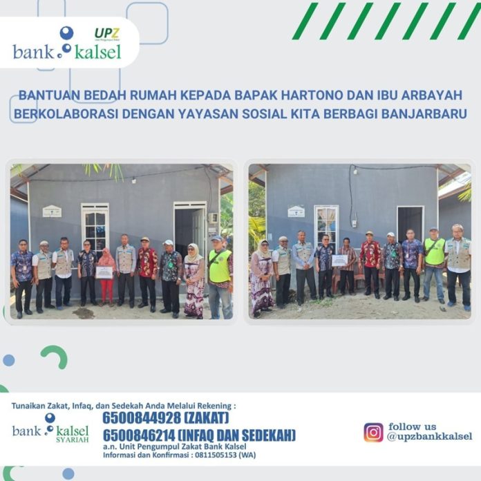 Melihat kondisi tersebut, UPZ Bank Kalsel memberikan bantuan dana bedah rumah kepada Bapak Hartono dan Ibu Arbayah dan dibantu oleh para relawan dari Yayasan Sosial Kita Berbagi Banjarbaru dalam hal bedah rumah.