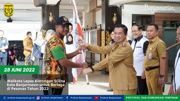 LANGKAR.ID,BANJARMASIN – Walikota Banjarmasin, H Ibnu Sina didampingi Sekretaris Daerah Kota Banjarmasin, Ikhsan Budiman melepas Kontingen Atlet Spesial Olympic Indonesia (SOIna) Kota Banjarmasin untuk mengikuti Pekan Spesial Olympic Nasional (Pesonas) Tahun 2022, di Lbbi Balai Kota Banjarmasin, Selasa (28/06).