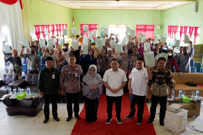 LANGKAR.ID, Batulicin – Kantor Pertanahan Kabupaten Tanah Bumbu (Tanbu) menyerahkan sertifikat tanah dari program Pendaftaran Tanah Sistematis Lengkap (PTSL) untuk warga di wilayah Kecamatan Kusan Hilir, yaitu Desa Api Api, Beringin, Pagaruyung dan Tanete.