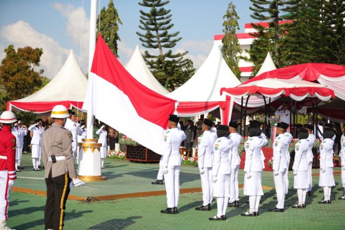 Berikutnya pengibaran bendera merah putih oleh Pasukan Pengibar Bendera (Paskibra) yang merupakan putera-puteri terbaik Tanbu.